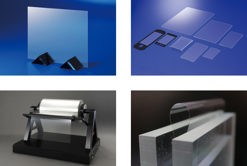 ディスプレイ用ガラス、超薄板ガラス、化学強化専用ガラスなどを取り扱っています。ディスプレイ用ガラスは、液晶や有機ELのテレビ、パソコン、スマートフォンのほか、車載ディスプレイ、ウェアラブル端末などに使用され、世界第2位のシェアを有しています。超薄板ガラスG-Leaf®は、厚さ0.2mm(200μm)以下でフィルムのように曲げることが可能で、電子デバイス用途での実用化が進んでいます。