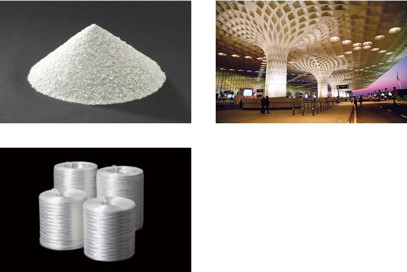 自動車、エネルギー、電機・電子、住設、社会インフラなどさまざまな分野で使用されるガラスファイバを製造しています。たとえば、Eガラスファイバは、樹脂と組み合わせることで樹脂成型品の強度、剛性、耐熱性を向上させます。自動車部品や住設機器、屋根材、床材などに使用され、寸法安定性や電気絶縁性により、電機・電子関連部材の小型化や薄型化などに役立っています。このほか、風力発電用風車ブレード(羽根)などに利用される高弾性率ガラスファイバや、耐アルカリ性に優れ、セメント製品に混ぜて使用される耐アルカリガラスファイバ<WizARG™>などを手掛けています。