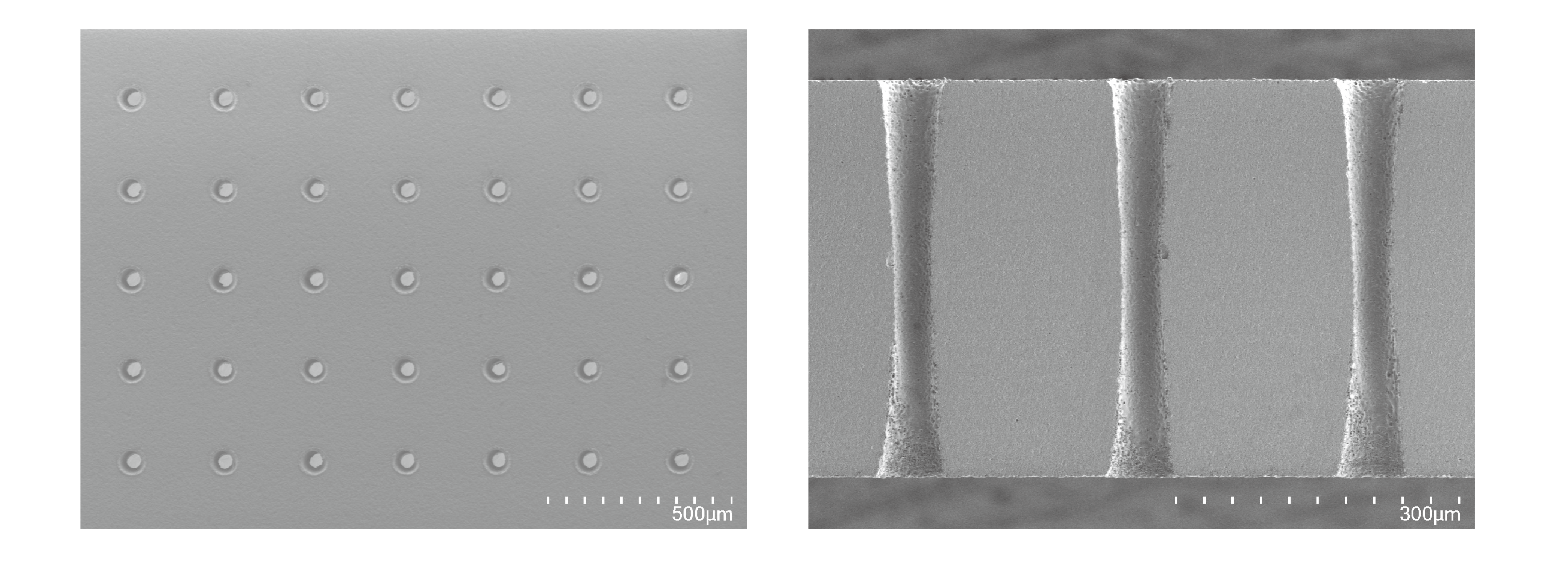 ガラスコア基板 SEM像の微細貫通穴(ビア)と断面画像