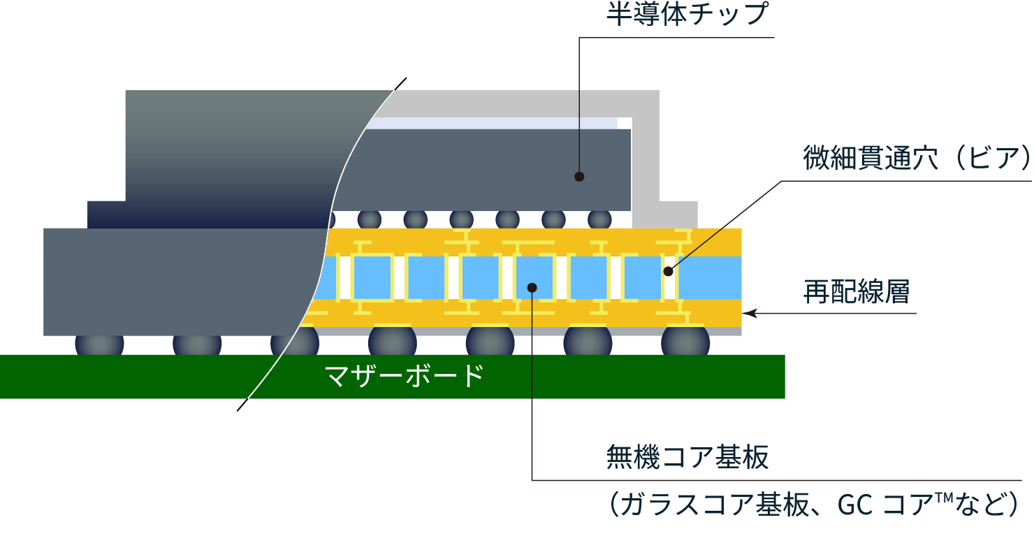 無機コア基板は、半導体チップと外部回路を接続する有機基板を無機の素材に置き換えたものです。従来のガラスエポキシ基板等の有機材料ベースの基板と比較して、優れた電気的特性、剛性、平坦性といった特長を有します。当社はガラスセラミックスコア基板GCコア™およびガラスコア基板の提供を進めています。