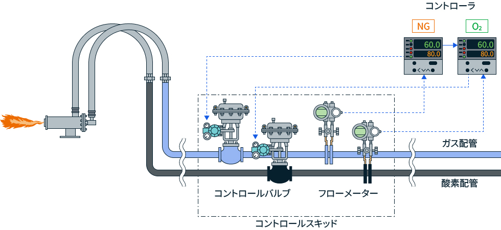 Gas-oxygen enriched burner piping unit (installation locations: glass melter, refiner, forebay, feeder)