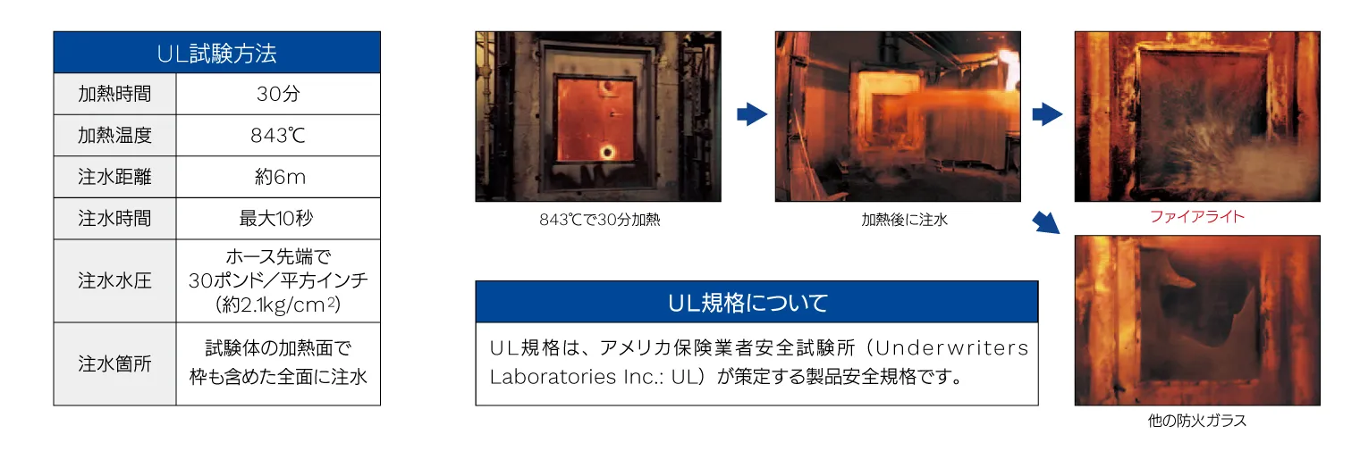 米国を代表する安全規格であるUL規格では、防火戸の試験として、消火作業時の安全面を考慮し、加熱試験に加えて加熱直後に放水試験を行い、消火作業中においても防火戸として著しい欠陥が起こらないことを確認することが義務づけられています。自主試験を行った結果、ファイアライト®はこの厳しいUL規格に適合することが確認されました。