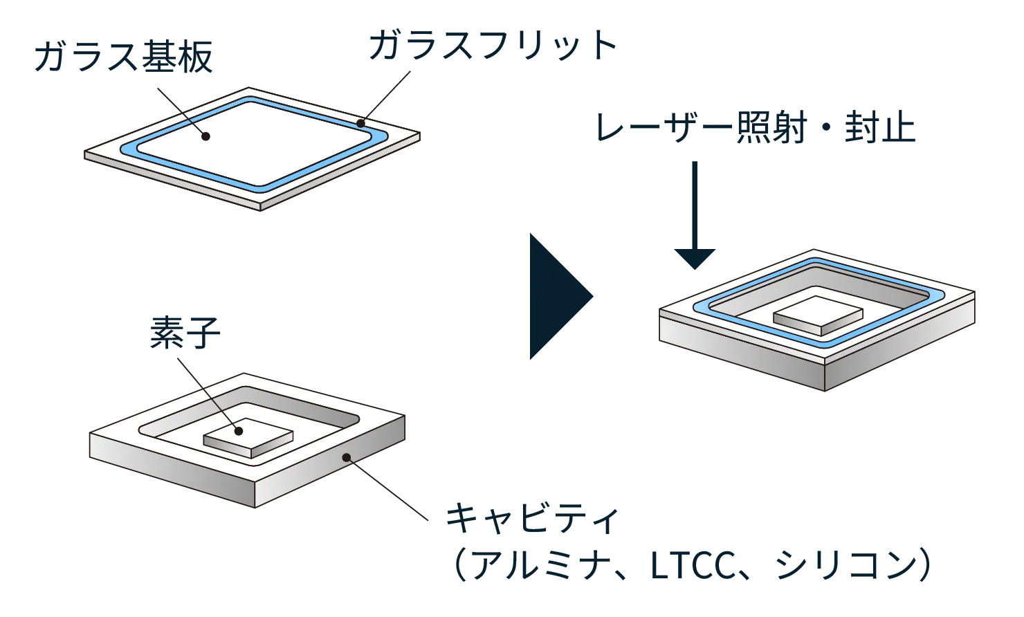 レーザー封止用ガラスフリットは、ガラス基板と異種材料(アルミナ、LTCC、シリコン)やガラス基板同士の気密封止を可能にします。封止時の素子への熱ダメージを避け、高い信頼性が必要とされるデバイスに使用できます。