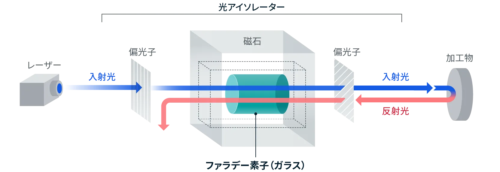 磁気光学効果の一つである「ファラデー効果」により、順方向に進む光のみを透過し逆方向の光を遮断する部品です。