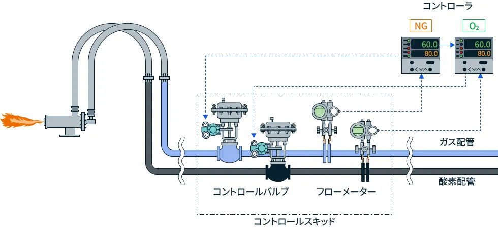 ガス-酸素富化バーナー用配管ユニット(設置場所:ガラス溶融炉 清澄室、フォアベイ、フィーダー)
