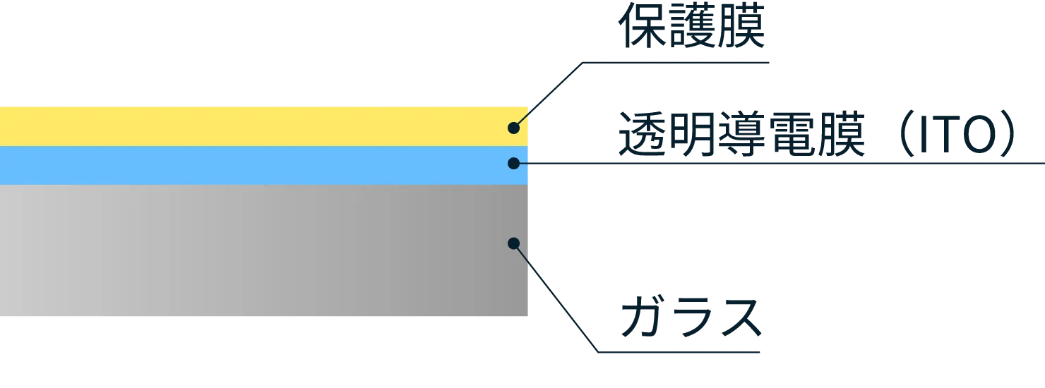 アンチモンのような有害な物質を含んでいない、環境にやさしい高性能材料です。保護膜により加熱時のITO 膜の酸化を抑え、導電キャリア減少による抵抗上昇を防ぎます。